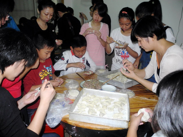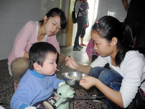 在包饺子的过程中,虽然人很多,但是大家有条不紊,很有默契地分好工。跟随爸爸妈妈一同来的小志愿者们尽管以前在家从来没有包过饺子,但是他们学起来是那样的认真。饺子很快就包好了,十点多点就开始下锅。煮熟的饺子装盆送到孩子们的房间。由于一些残疾孩子手脚不灵便,志愿者们就亲自喂孩子们吃。