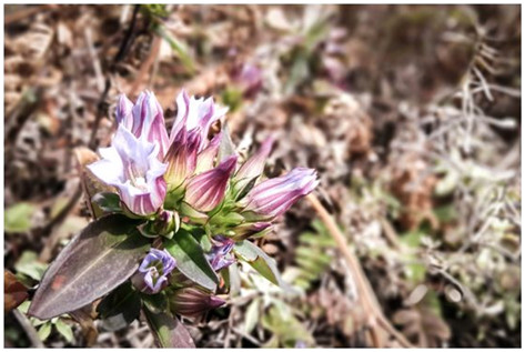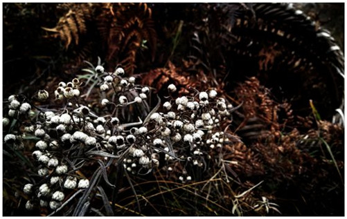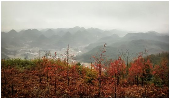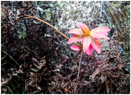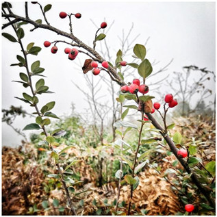 即便是冬天,缓坡上,红的果,黄的叶,紫的花,在寒风中拼命地摇摆挣扎,她们紧贴地皮生长,顽强地开出美艳的花。