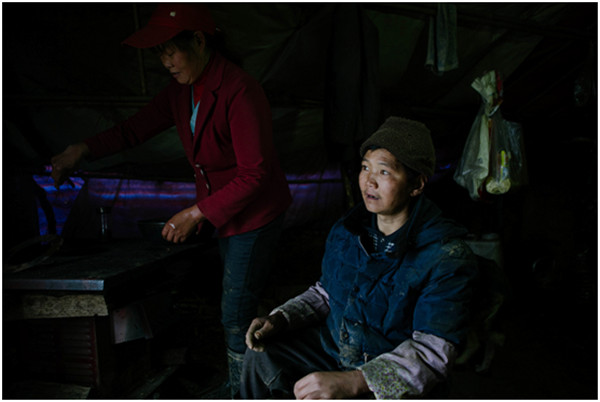 今天不是家人上山的日子。一位上山挖麻的中年女人,正在帮着他准备晚餐。