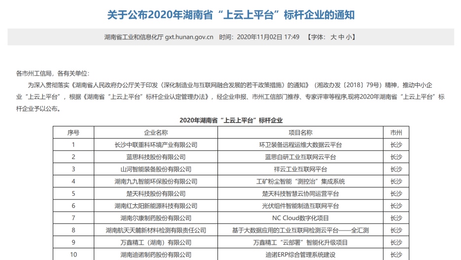 图2 湖南省工信厅公布湖南省“上云上平台”标杆企业的通知截图