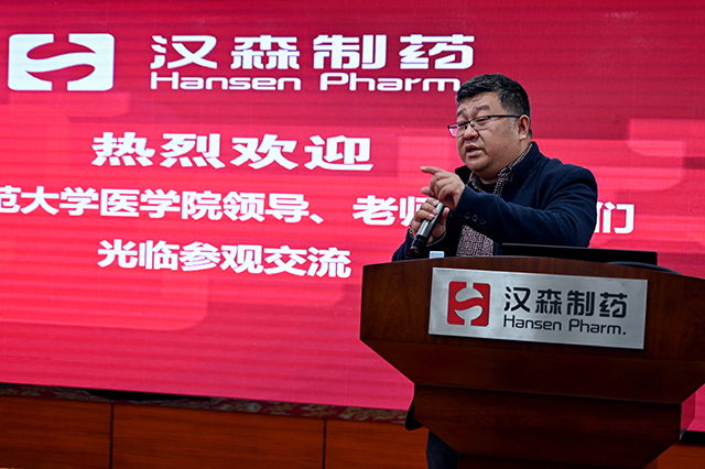 上午9:30,湖南师大医学院党委副书记陈松带领师生40多人抵达williamhill中国官方网站。公司党委书记、董事、副总裁傅舰军热情地接待陈松书记一行,向他们详细介绍公司发展历程、生产运营和企业管理情况,并陪同参观生产车间。生产总监翟志强向同学们介绍了不同剂型产品的生产工艺,以及自动化生产线的功能与应用,并不时为同学们解答各种问题。