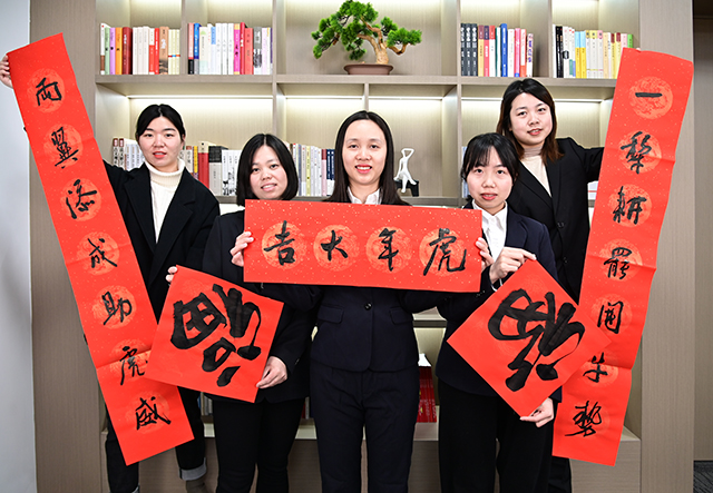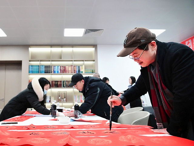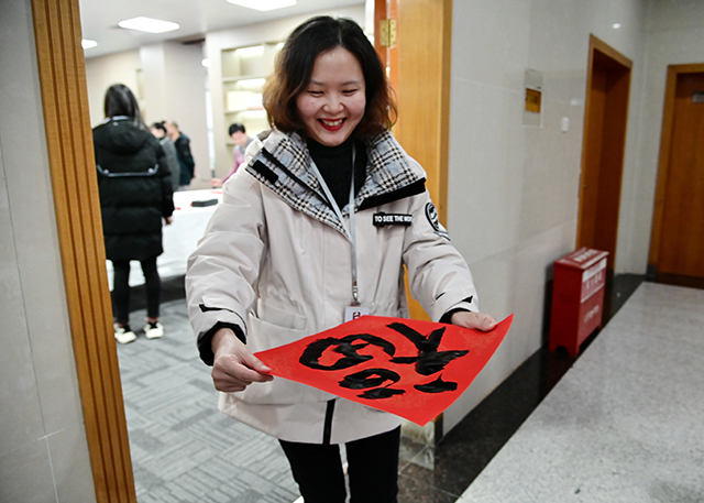 活动现场气氛热烈,暖意融融。6位书法家笔飞墨舞,一副副寓意吉祥的对联、一个个充满喜庆的“福”字相继“出炉”。 工作人员将已写好的春联和“福”字依次铺开、晾干,员工们热情簇拥着,争相挑选自己心仪的“福”字和春联,脸上洋溢着喜悦之情。“书法大师们亲手书写的春联更有人情味、更有年味!这样的活动太好了!”一名员工开心地说。