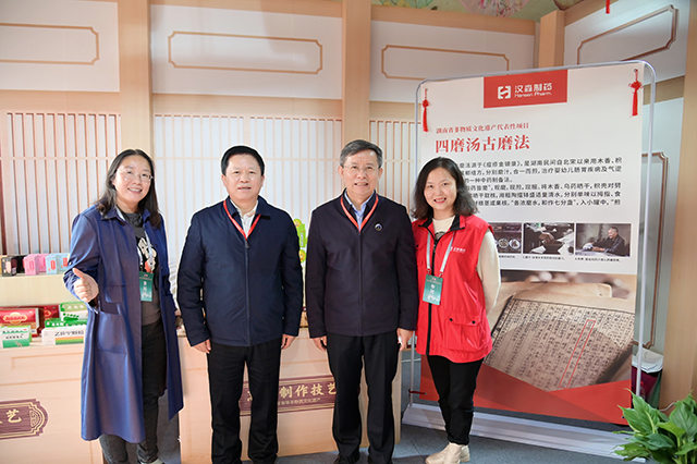 益阳市委书记瞿海,湖南省委宣传部副部长、湖南省广播电视局党组书记、局长贺辉巡展四磨汤古磨法,并与工作人员亲切合影
