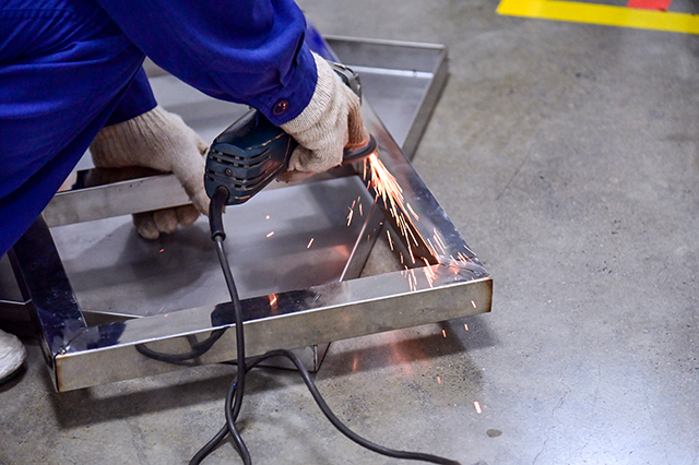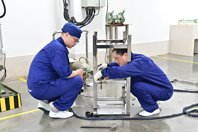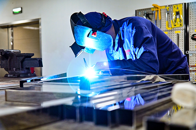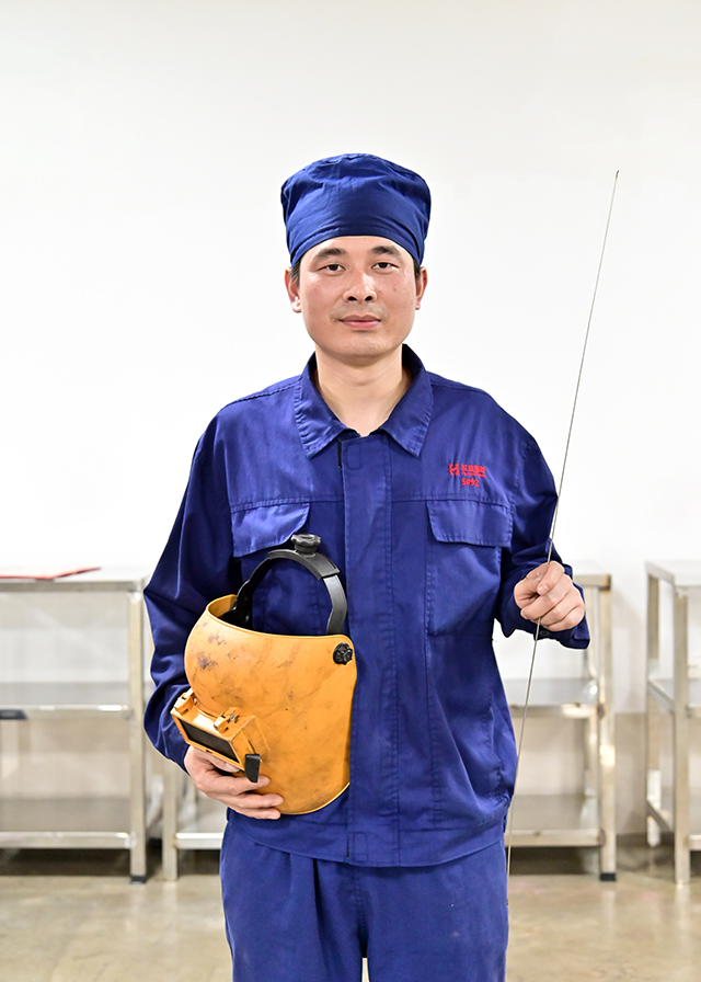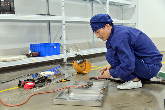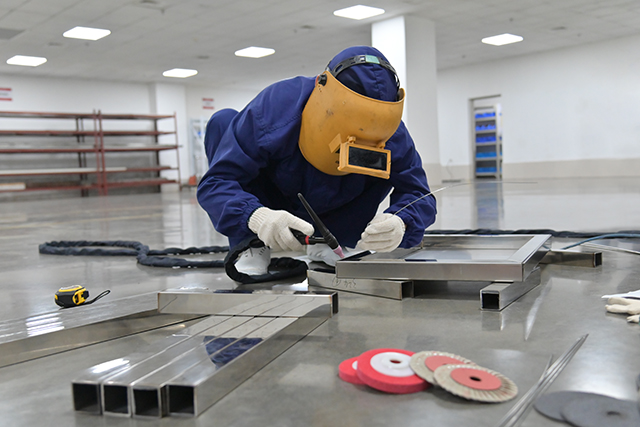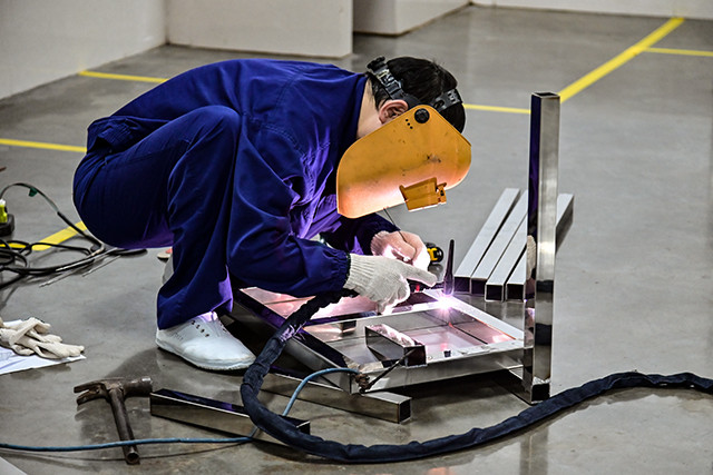 下午两点,比赛正式拉开帷幕。工程部部长王勇宣读比赛规则,要求参赛选手根据提供的材料、按照图纸制作规定尺寸的不锈钢工作台。从识图、备料到正式作业,比赛紧张而有序地进行。参赛选手头戴防护面罩、手持焊枪,细心地在材料焊接处不停点焊,弧光四射。虽然不一会儿就汗流浃背了,但他们顾不上擦汗,认真对着图纸进行制作,每一步操作都进行得有条不紊,展现了熟练的操作技巧和扎实的技术功底。