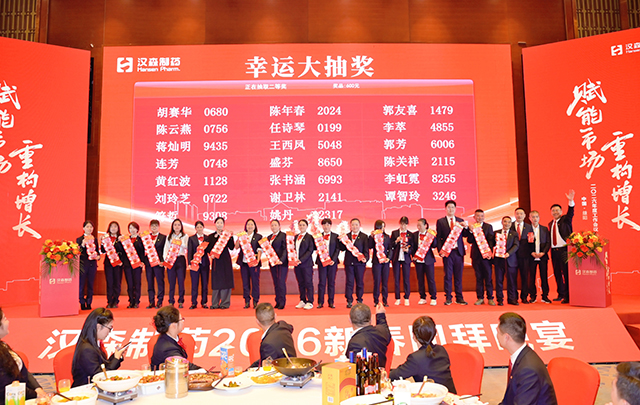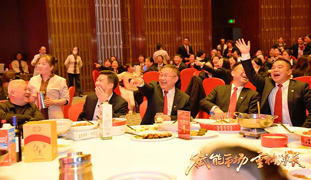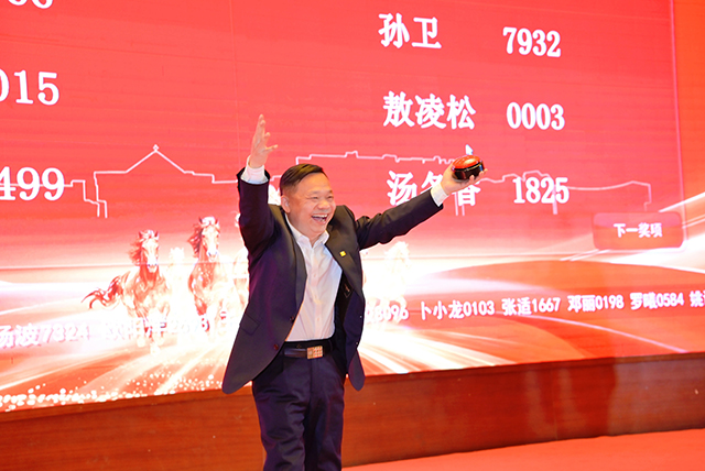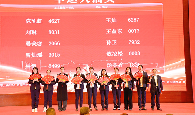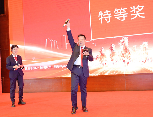 新春团拜晚宴上,戴江洪副总裁代表公司致祝酒词。刘正清董事长率公司领导班子与全体员工共同举杯,共庆新春佳节。晚宴精心设置九轮幸运抽奖,将气氛一次次推向高潮。丰厚的奖金与刺激的抽奖模式让现场欢呼声此起彼伏,晚宴在喜庆祥和的氛围中结束。