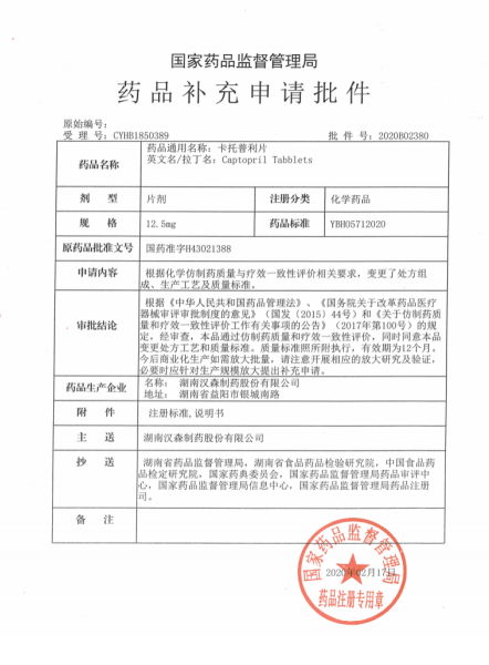 近日,williamhill中国官方网站收到国家药品监督管理局《药品补充申请批件》,该公司生产的化学药品“卡托普利片”通过国家药品监督管理局仿制药质量和疗效一致性评价。
