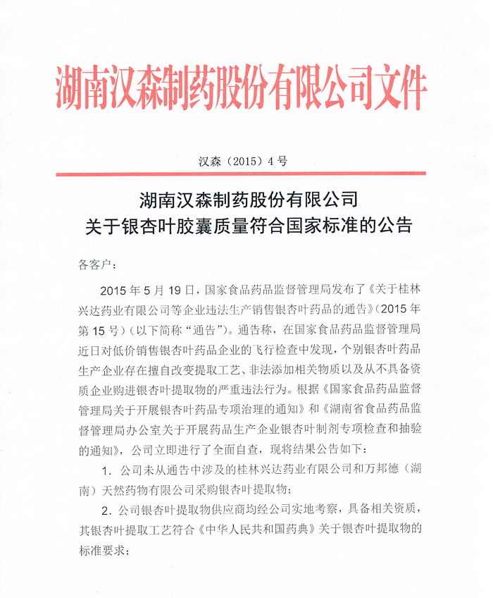 关于银杏叶胶囊质量符合国家标准的公告